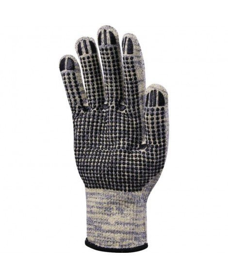 El guante Venicut 56 está fabricado en fibra sintética TAEKI®5 de polietileno de altas prestaciones, material líder en protección anticorte. Su galga 10 proporciona ajuste ceñido y alta destreza, mientras los puntitos PVC en palma ofrecen agarre reforzado en seco y húmedo sin perder sensibilidad táctil. Nivel de corte 5/C para resistencia superior a cuchillas y bordes afilados, perfecto para trabajos que requieren precisión y seguridad máxima.