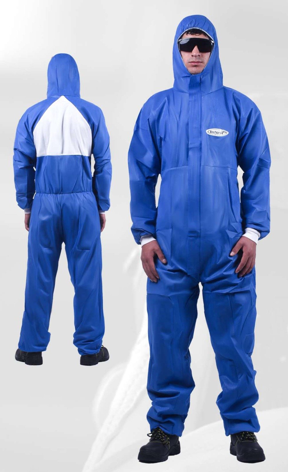 Ajuste ergonómico: Triángulo dorsal de SMS transpirable para mayor movilidad, elásticos de neopreno (libre de látex) en puños y cintura, y cierre frontal de nylon sobre poliéster trenzado.