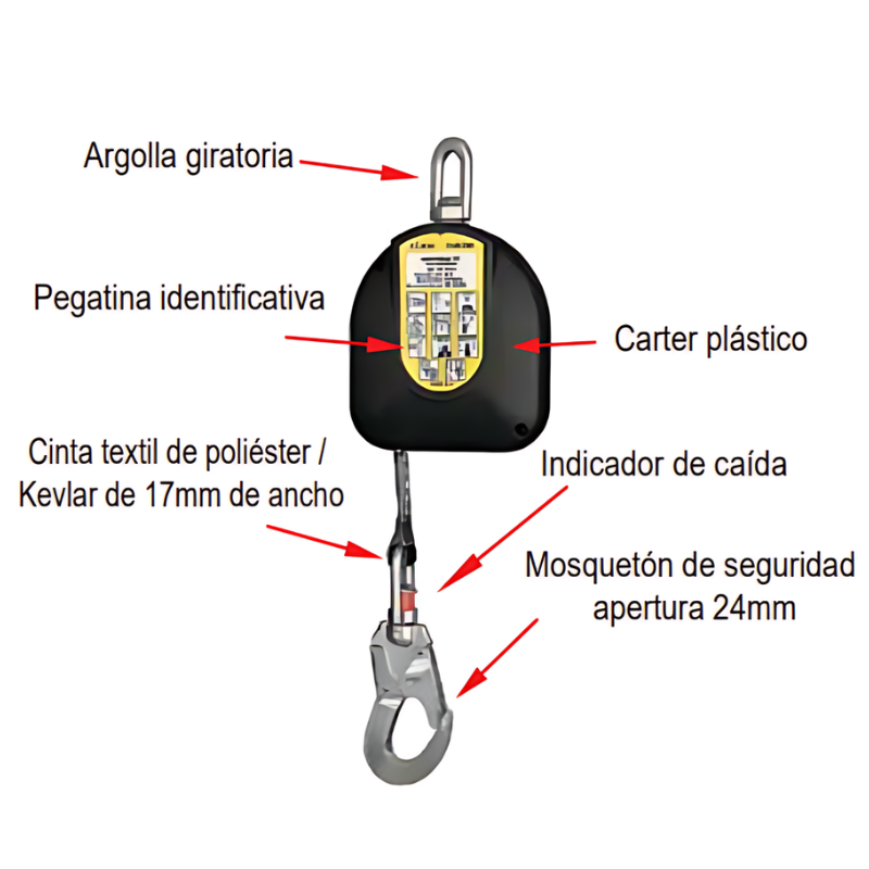 El retráctil cable de acero es un anticaídas automático de reposición con carter sintético reforzado en fibra de vidrio y cable de acero de 4 mm de diámetro. Incluye argolla giratoria, pegatina identificativa, indicador de caída visible, mosquetón de seguridad con apertura 24 mm y cinta textil poliéster/Kevlar de 17 mm en la conexión. Protección total contra caídas en altura con recuperación automática del cable. Ideal para trabajos verticales, andamios, plataformas, torres eléctricas, construcción, minería y mantenimiento en Ecuador. ¡Seguridad absoluta en altura! Cotiza retráctil cable de acero ahora por WhatsApp y recibe entrega rápida en todo el país.